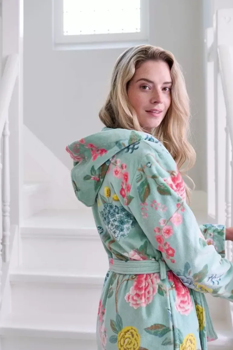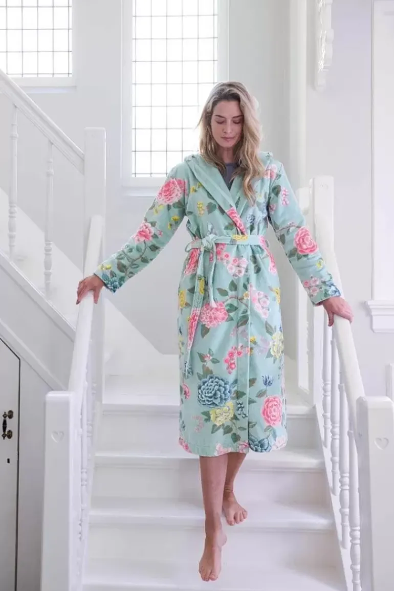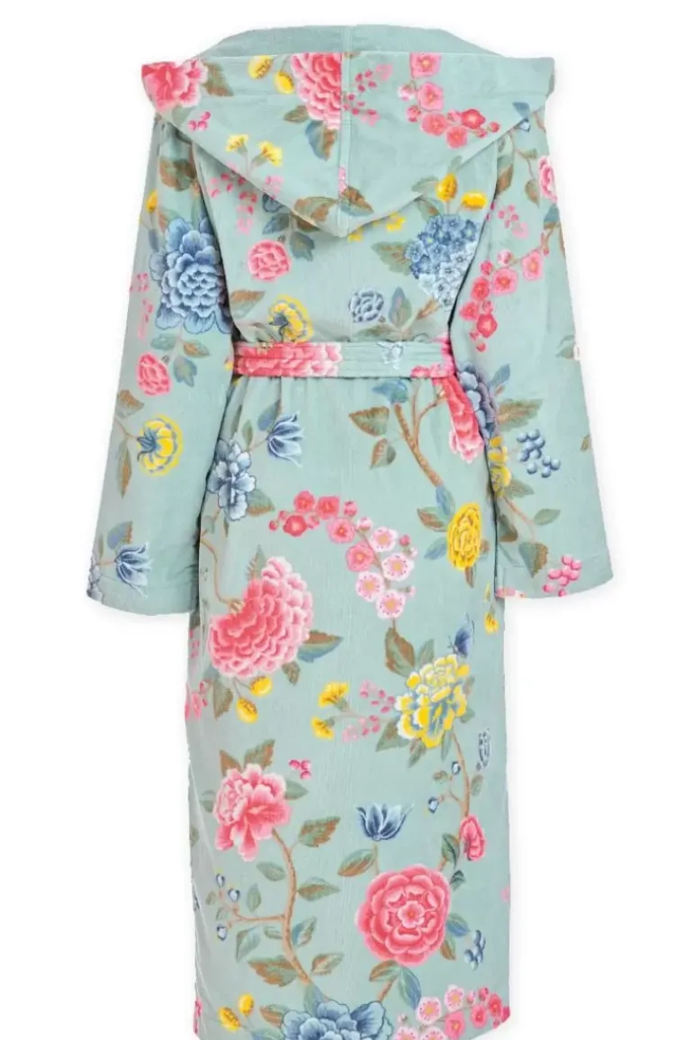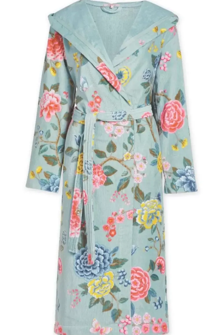 Deze Zachte Blauwe Badjas Is Versierd Met Het Good Evening Dessin Vol Kleurrijke Bloemen. De Badjas Heeft Steekzakken En Een Capuchon. De Badjas Dient Voor Gebruik Gewassen Te Worden Volgens Het Care Label.