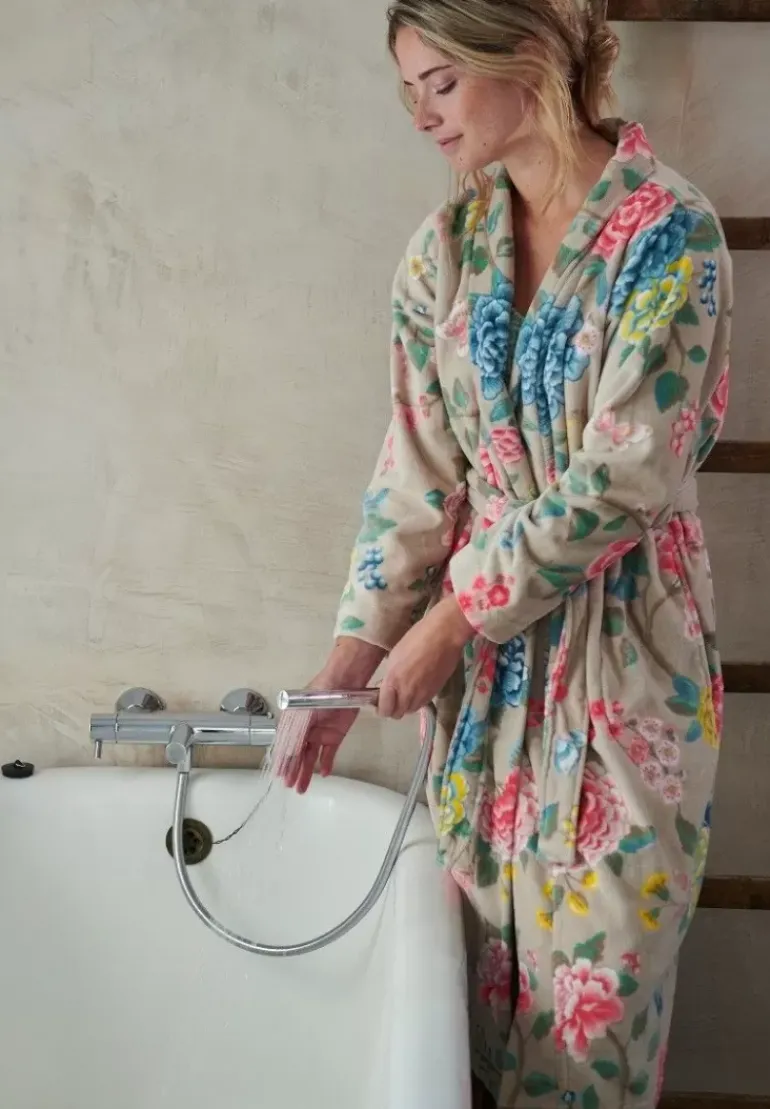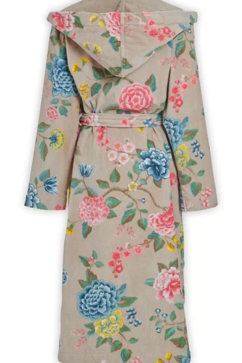 Deze Zachte Khaki Badjas Is Versierd Met Het Good Evening Dessin Vol Kleurrijke Bloemen. De Badjas Heeft Steekzakken En Een Capuchon. De Badjas Dient Voor Gebruik Gewassen Te Worden Volgens Het Care Label.