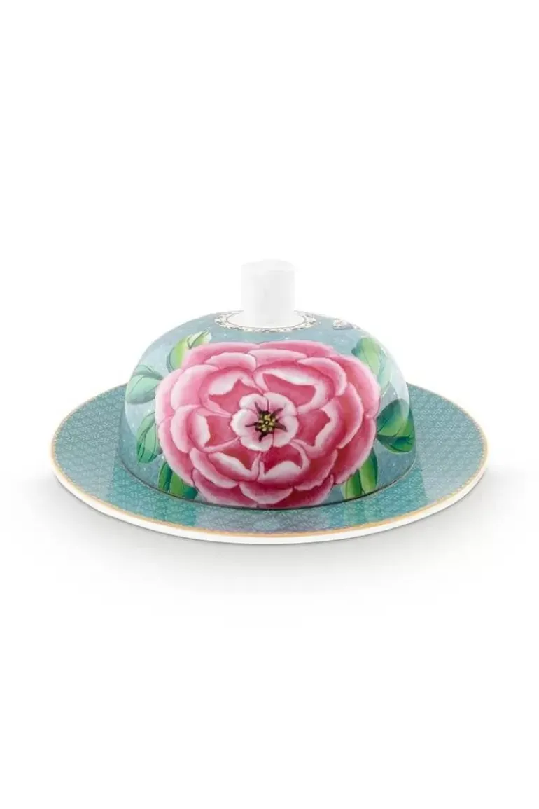 Deze Blauwe Botervloot Van Porselein Is Rondom Versierd Met Een Exotische Bloem. De Grote Roze Bloem Valt Een Stukje Over De Rand Heen En De Achtergrond Heeft Een Verfijnd Dessin. Combineer Met De Rest Van Het Servies Uit De Blushing Birds Collectie.