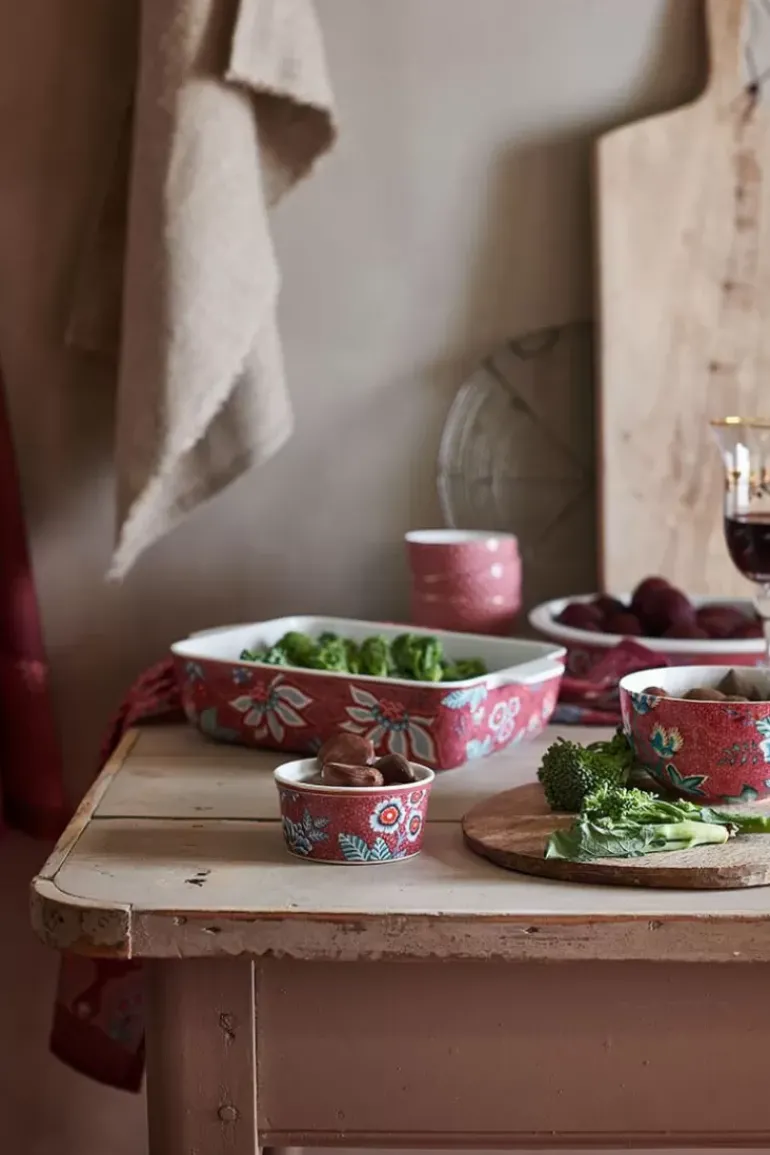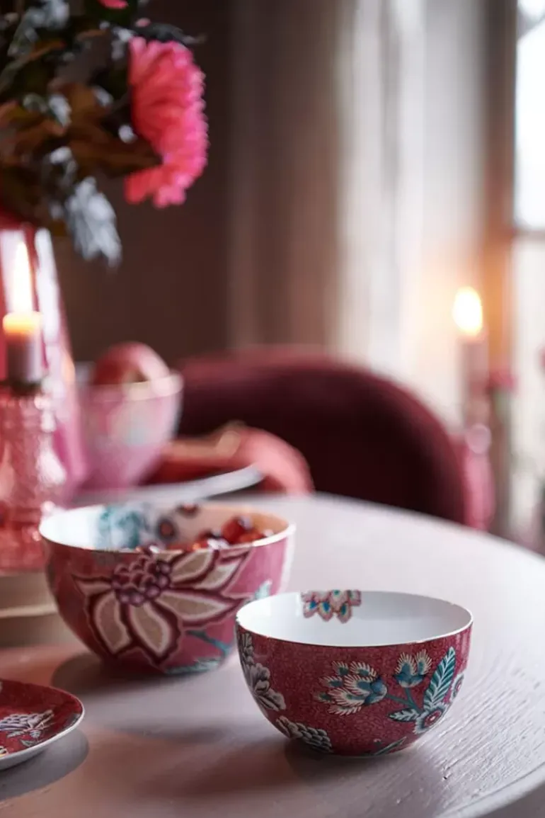 Fleur Je Tafel Op Met Deze Kom Uit De Flower Festival Collectie. De Kom Heeft Een Bloemendessin Met Fantasierijke Rode En Roze Chintzbloemen Met Lichtblauwe En Groene Bladeren.
