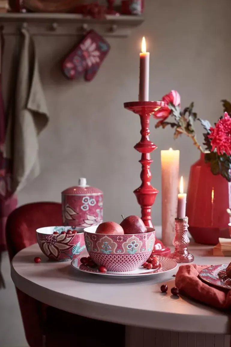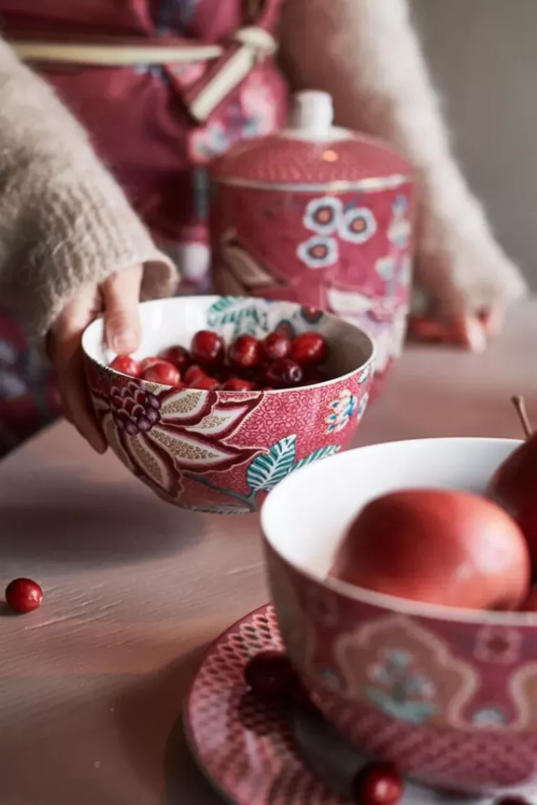 Fleur Je Tafel Op Met Deze Kom Uit De Flower Festival Collectie. De Kom Heeft Een Bloemendessin Met Fantasierijke Rode En Roze Chintzbloemen Met Lichtblauwe En Groene Bladeren.