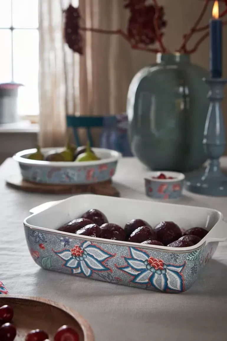 Bak Je Gerechten In Deze Vrolijke Ovenschaal Uit De Flower Festival Collectie. De Ovenschaal Heeft Een Bloemendessin Met Fantasierijke Rode En Roze Chintzbloemen Met Lichtblauwe En Groene Bladeren.