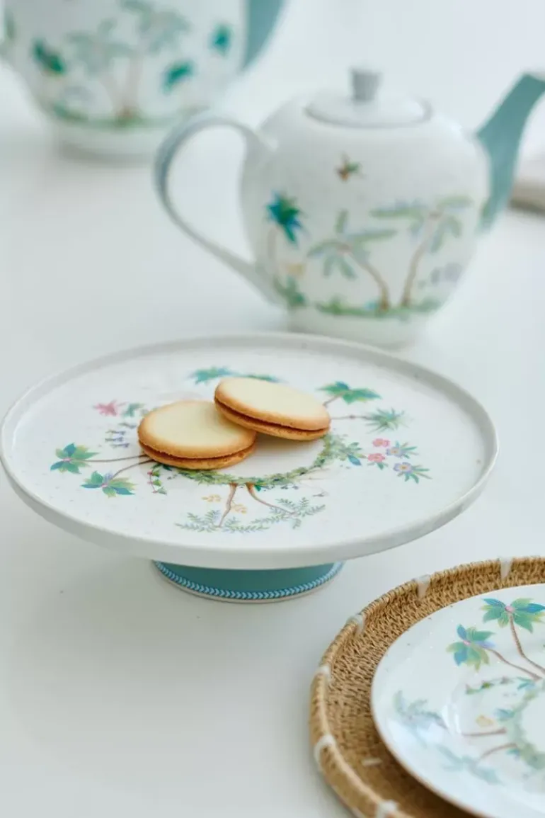 Gebruik Deze Taartplateau Bij Een High Tea Met Vrienden Om Een Heerlijke Taart Te Laten Zien. De Bodem Van Deze Taartplateau Is Blauw, Wat De Schaal Een Elegante Uitstraling Geeft. Het Bord Van Dit Dienblad Heeft Een Witte Achtergrond Met Gouden Stippen. Bovendien Geeft De Taartplateau Je Het Gevoel Van Een Tropisch Eiland Door Zijn Design. In Het Midden Vind Je Verschillende Planten, Bloemen En Prachtige Palmbomen.