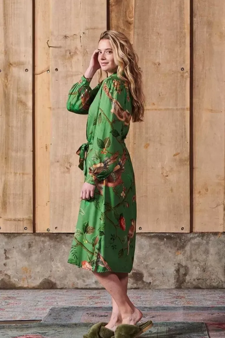 Deze Jurk In De Kleur Groen Is Uitgevoerd Met Het Rijke Good Nightingale Dessin. Het Herhaalde Bloemdessin Is Opgebouwd Uit Een Variatie Van Fantasierijke Chintz Bloemen En Vogels. Het Nachthemd Bevat Een V-Hals Kraag Hals Met Bijpassende Knopen.