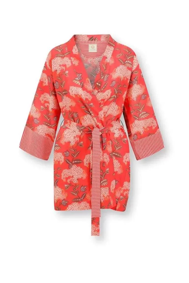 De Korte Kimono Is Jouw Zomer Musthave! De Prachtige Bloemenprint Flora Firenze Fleurt Je Dag Meteen Op. De Manchetten En Riem Zijn Afgewerkt Met Little Sumo Stripe Dessin. Verbeeldt Jezelf Eens Voor Op Een Zonnige Dag Op Het Terras. Deze Koraalroze Kimono Neemt Je Mee Naar Die Zomerdromen En Is Perfect Voor Alle Gelegenheden.Je Kan De Kimono Ook Perfect Combineren Met Een Spijkerbroek, Of Casual Op Het Strand Als Cover-Up. De Mogelijkheden Zijn Eindeloos!