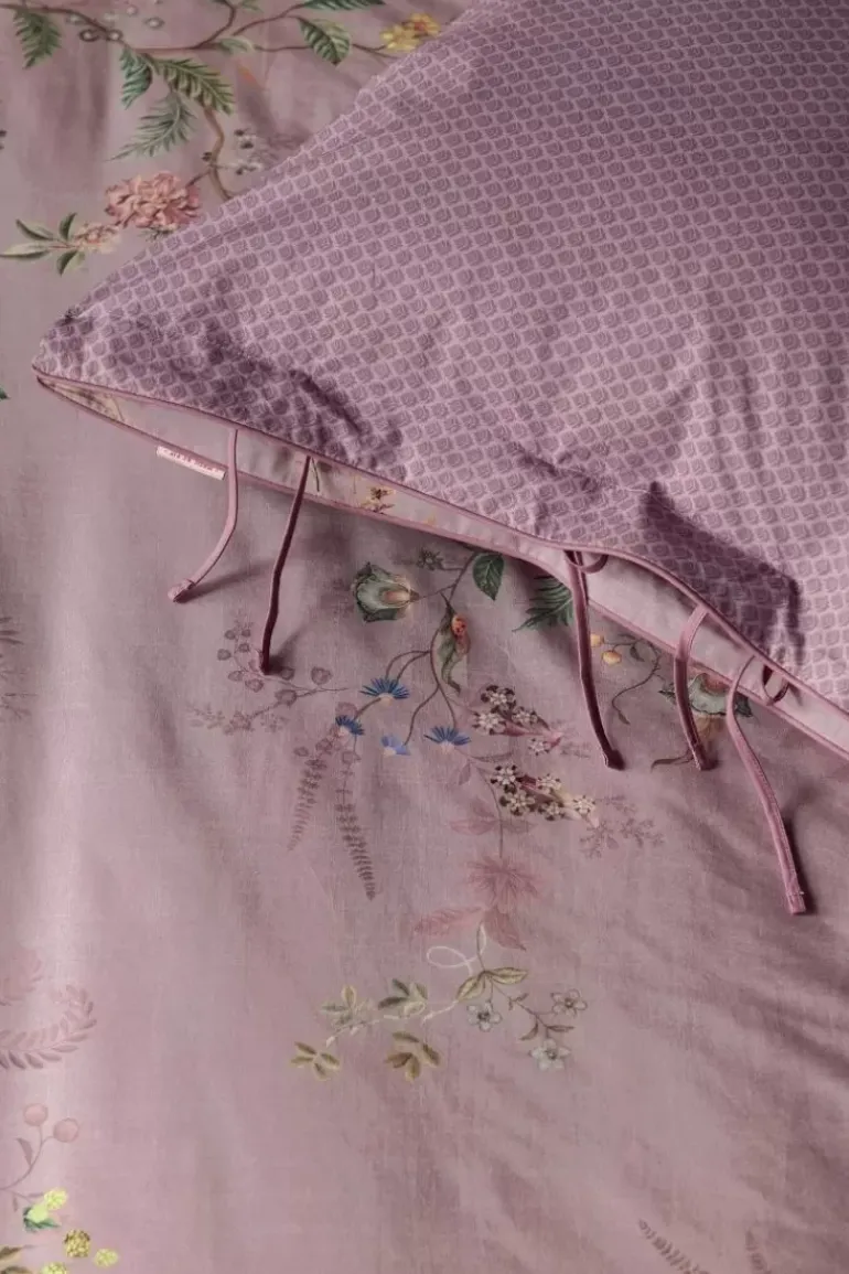 Het Autunno Kussensloop Heeft Een Dessin Van Elegante Bloemtakken Op Een Lila Ondergrond En Verticale Banden Met Aan Weerszijden Een Kleine Geometrische Print. Aan Elke Tak Groeien Verschillende Fantasiebloemen, Bessen En Bladeren En Hier En Daar Houdt Een Vogel Zich Schuil Tussen De Bladeren.