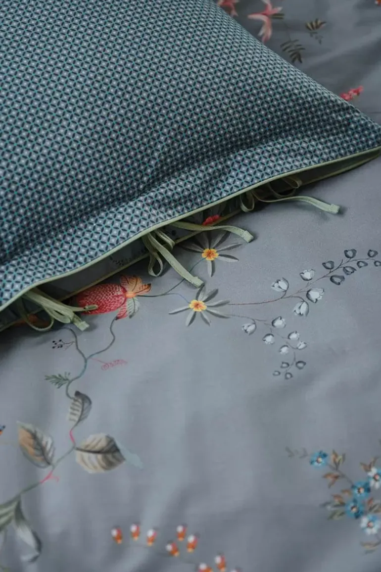 Dit Kussensloop In Blauw Is Geprint Met Het Fleur Grandeur Dessin. Deze Print Is Opgebouwd Uit Elegante Siertakken En Fantasiebladeren. Het Kussen Bevat Een Doorgestikte Rand, Striksluiting En Is Afgewerkt Met Een Gekleurde Bies. De Achterkant Is Geprint Met Een Boogjes Dessin, Hierdoor Kan Het Kussen Dubbelzijdig Gebruikt Worden.