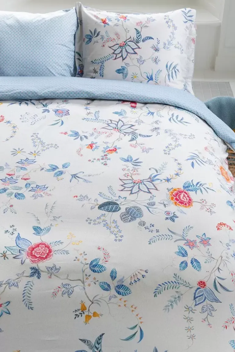 Het Witte Kussensloop Flower Festival Bestaat Uit Een Rijk Bloemendessin, Opgebouwd Uit Een Variatie Van Fantasierijke Rode En Roze Chintzbloemen Met Lichtblauwe En Groene Bladeren. De Speels Geplaatste Bloementakjes Met Grote Uitgewerkte Gedecoreerde Bloemen En Bladeren Geven Dit Verfijnde Dessin Een Extra Rijke Beleving.