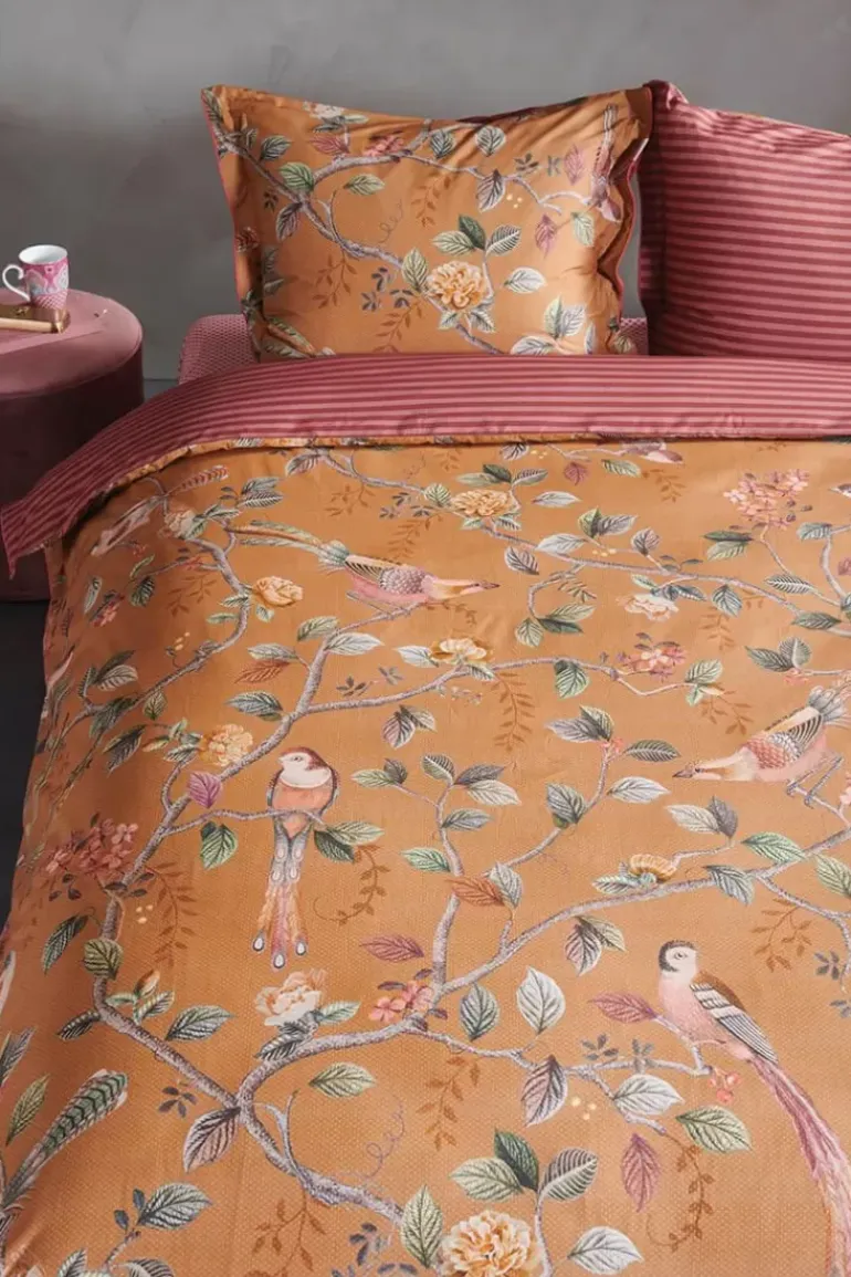 Dit Kussensloop In Geel Is Geprint Met Het Good Nightingale Dessin. Deze Print Is Opgebouwd Uit Bloemtakken En Verschillende Soorten Bloemen En Vogels. Het Kussen Bevat Een Doorgestikte Rand, Striksluiting En Is Afgewerkt Met Een Gekleurde Bies. De Achterkant Is Geprint Met Een Streepdessin, Hierdoor Kan Het Kussen Dubbelzijdig Gebruikt Worden.