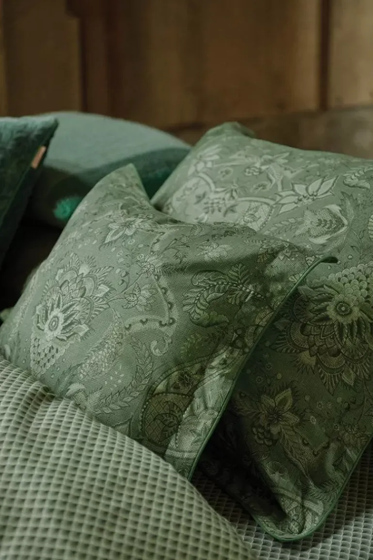 Dit Kussensloop In Groen Is Geprint Met Het Kyoto Nights Dessin. Deze Print Is Opgebouwd Uit Symmetrisch Geplaatste Bloemen En Ornamenten. Het Kussen Bevat Een Doorgestikte Rand,Knoopsluiting En Is Afgewerkt Met Een Fel Gekleurde Bies. De Achterkant Is Geprint Met Een Boogjes Dessin, Hierdoor Kan Het Kussen Dubbelzijdig Gebruikt Worden.