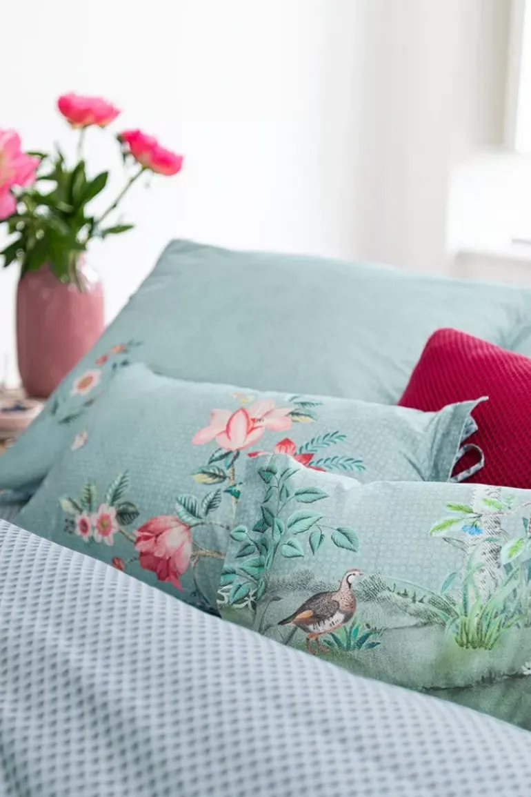 Dit Romantische Okinawa Kussensloop Is Geinspireerd Op Oosterse Chinoiserie-Prints. Japanse Bloesem Decoreert Dit Kussensloop. De Zachte Blauwe Kleur Van Dit Sierkussen Zorgt Ervoor Dat Het Een Rustige Maar Elegante Uitstraling Geeft Op Je Bed.