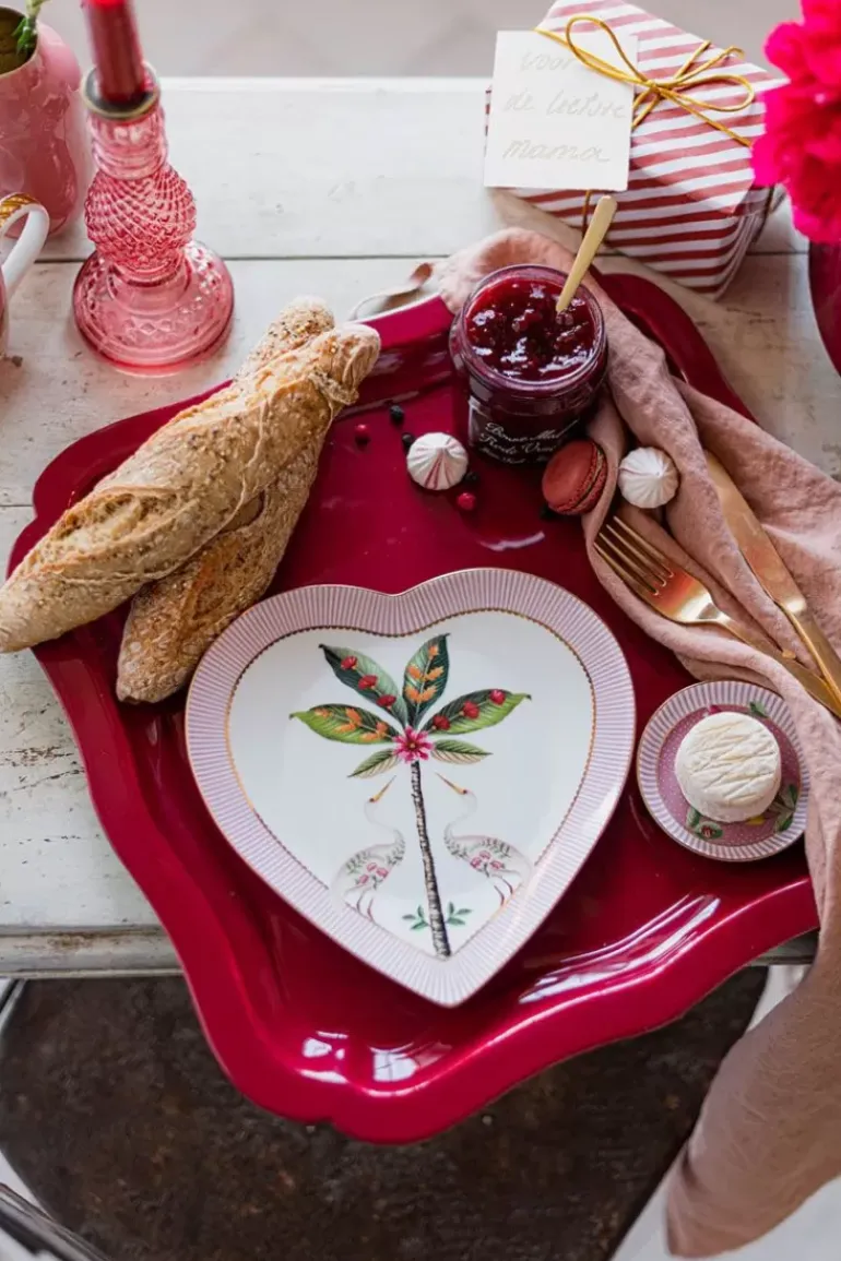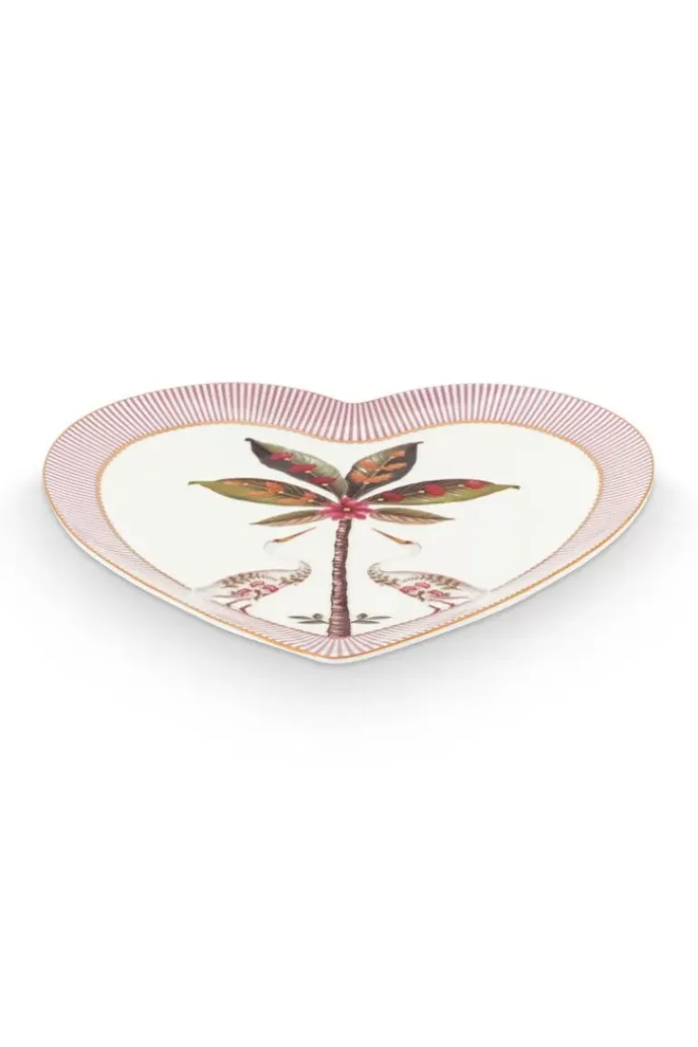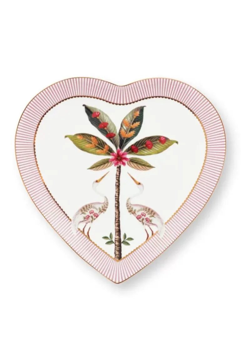 Vul Je Servies Aan Met Deze Set Van Twee Hartvormige Borden Van 21.5 Cm. Deze Borden Hebben Een Roze En Witte Achtergrond En Zijn Versierd Met Het Vrolijke La Majorelle Dessin. Dit Dessin Bestaat Uit Een Exotische Palmboom Waar Twee Reigers Omheen Zijn Gedecoreerd. Daarnaast Bestaat Het Dessin Uit Elegant Geplaatste Bloemen. De Rand Van Het Bord Is Versierd Met Roze Met Witte Strepen En Geven Het Bord Een Rijke Uitstraling. Met Ons La Majorelle Porselein Zul Je Jouw Servieskast En Tafel Laten Stralen!