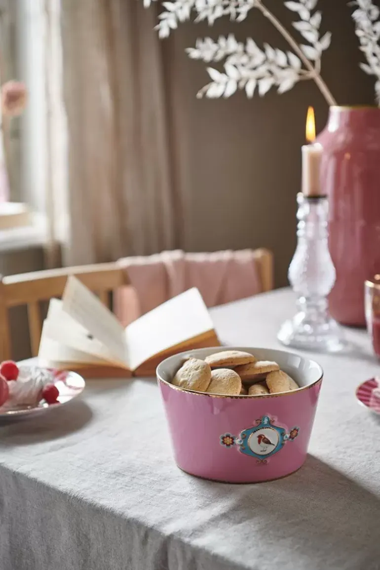 Een Roze Kom Met Pip’S Favoriete Love Birds Dessin. De Kom Heeft In Het Midden Een Medaillon Met Een Geschilderde Vogel, Een Roodborstje. Binnenin De Kom Komen Elementen Uit Het Dessin Terug En De Rand Is Afgewerkt Met Gouden Details. Vormt Een Mooie Combinatie Met De Rest Van Het Servies Uit De Love Birds Collectie.