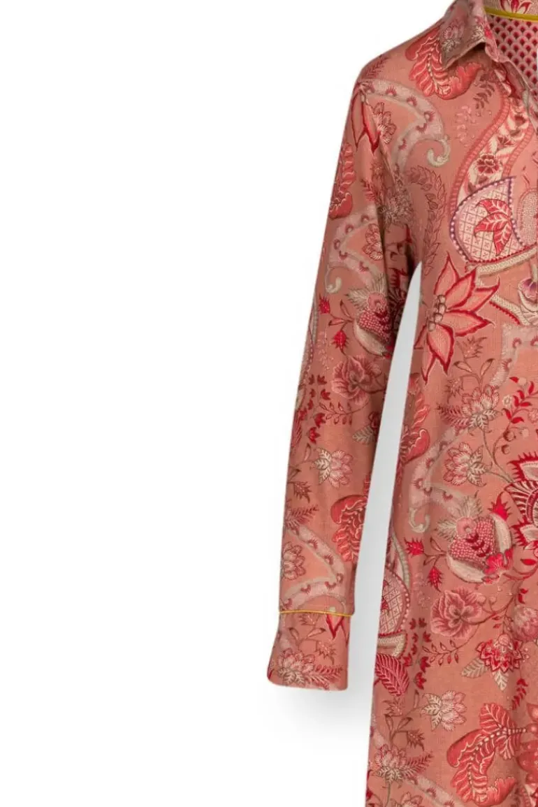 Dit Nachthemd In Het Terra Roze Is Uitgevoerd Met Het Vrolijke Kyoto Festival Dessin. Het Herhaalde Bloemdessin Is Opgebouwd Uit Een Variatie Van Fantasierijke Chintz Bloemen En Bladeren. Het Nachthemd Bevat Een Kraag Hals Met Bijpassende Knopen.