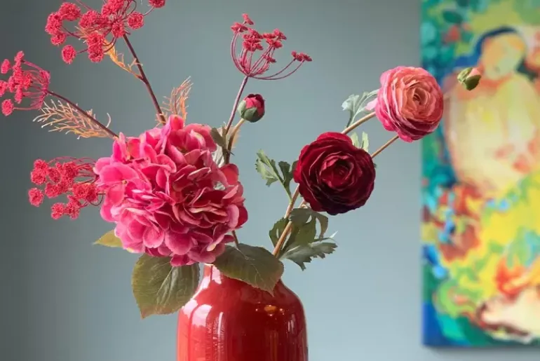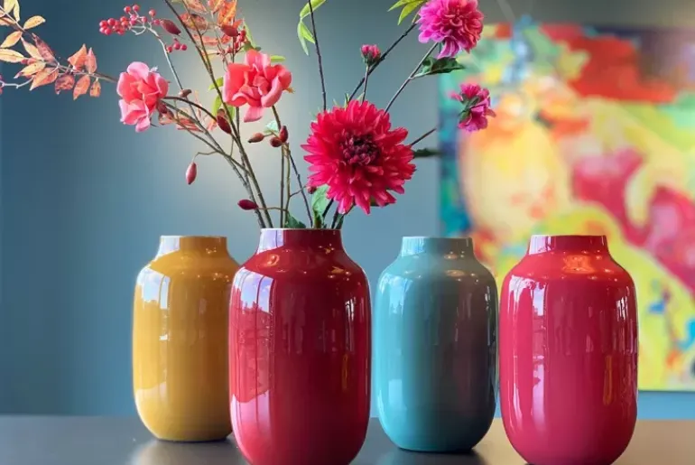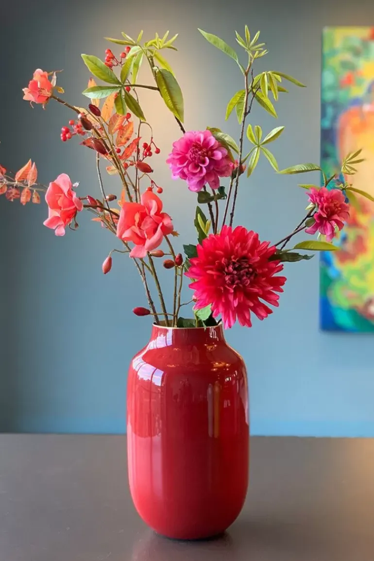 In Deze Rode Ovale Metalen Vaas Uit De Blushing Birds Collectie Komen Je Bloemen Extra Mooi Uit. Ook Verkrijgbaar In Andere Kleuren En In Een Ronde Variant. Combineer Deze Vaas Met Onze Pip Bloemen Voor Een Prachtig Resultaat.