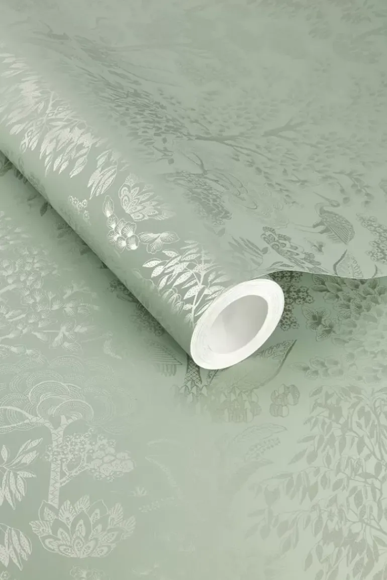 Geef Je Huis Een Betoverende Make-Over Met Het Prachtige Origami Behang In De Kleur Licht Groen/Zilver. Het Design Heeft Een Herhaald Patroon Van Uitgewerkte Gestileerde Bomen En Vogels. De Matte Ondergrond Met Metallic Print Geeft Het Behang Een Speciale En Verfijnde Uitstraling. Het Origami Behang Is Verkrijgbaar In Meerdere Kleuren: Gebroken Wit/Zilver, Oker/Goud, Terra/Rose Goud En Donkerblauw/Rose Goud.