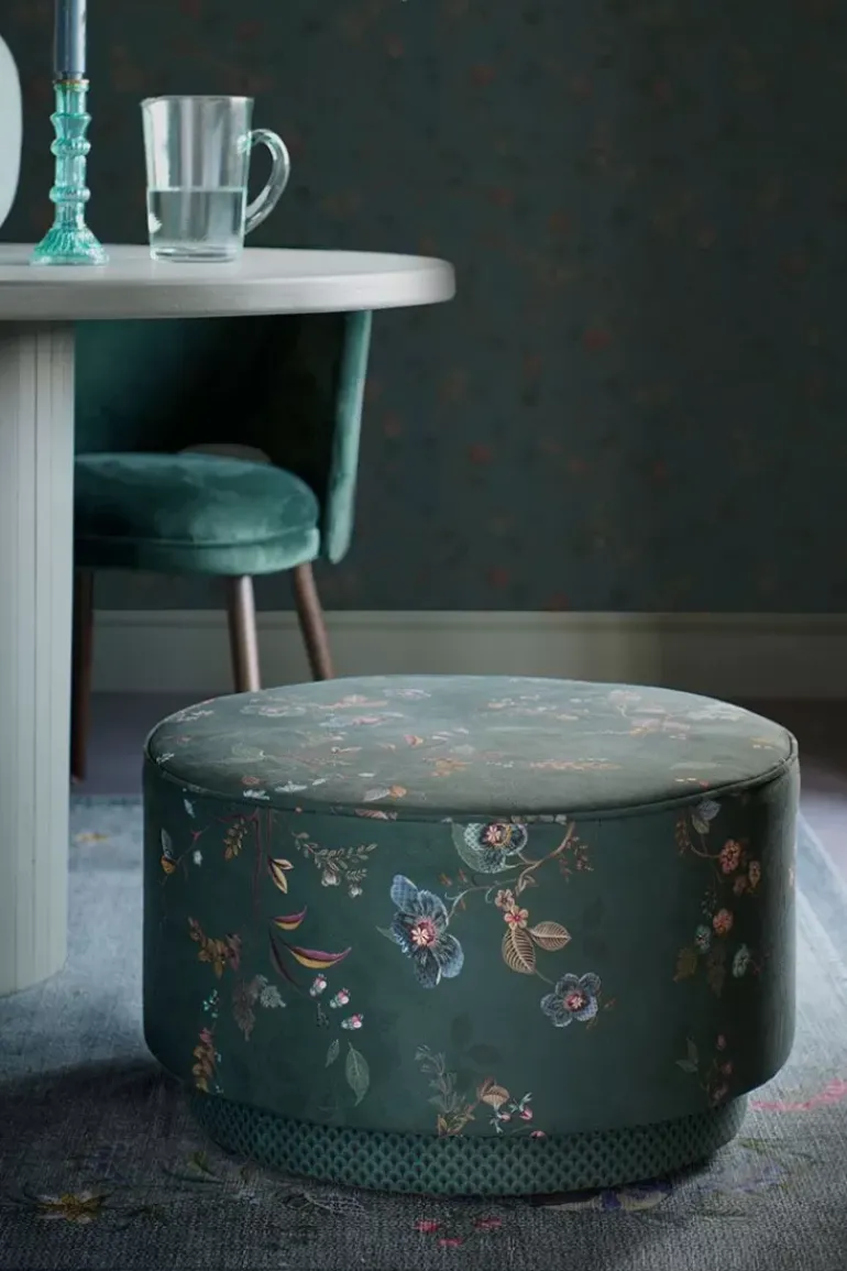 Decoreer Je Huis Met Deze Mooie Groene Large Kawai Flower Poef. Het Design Bestaat Uit Sierlijke Takken Met Bloemen, Rondom En Op De Bovenkant. De Onderkant Heeft Een Suki Print. Combineer De Poef Met Een Vloerkleed En Maak Er Een Magische Plek Van. De Poef Kun Je Gebruiken Als Zitje Of Om Je Benen Op Te Laten Rusten.