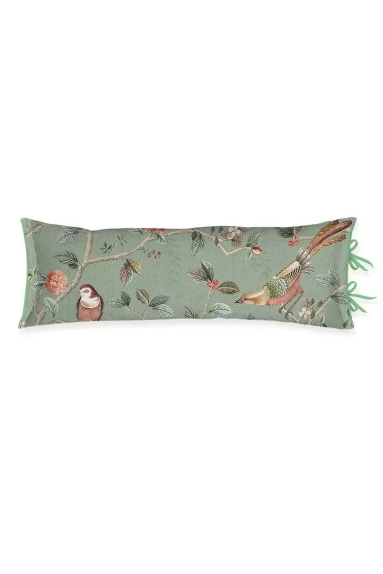 Dit Lange Rechthoekige, Lichtgroene Kussen Is Versierd Met Het Good Nightingale Dessin. Deze Print Is Opgebouwd Uit Bloemtakken En Verschillende Soorten Bloemen En Bevat Een Vogel. Het Sierkussen Heeft Een Oxford Rand Aan De Zijkanten En Een Patroon Van Gestileerde Strepen Aan De Achterkant. Het Sierkussen Is Afgewerkt Met Een Striksluiting En Kan Dubbelzijdig Gebruikt Worden.