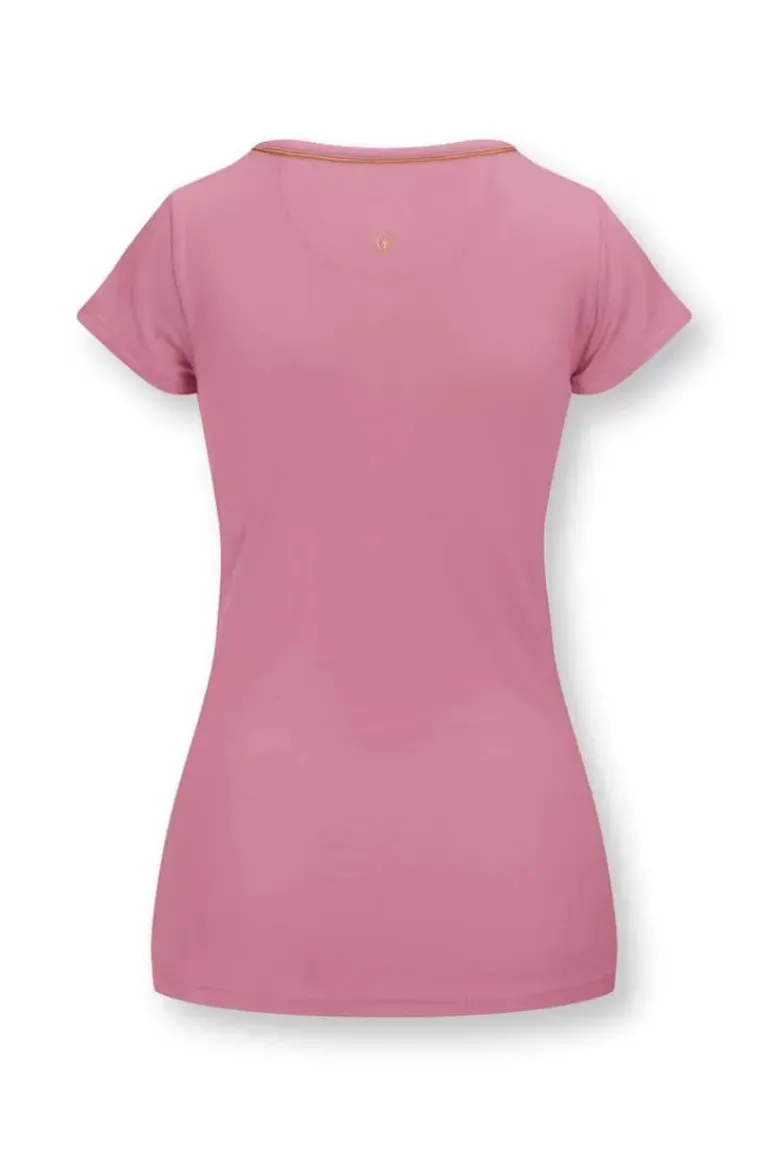 Deze Top Met Korte Mouwen In Roze Is Uitgevoerd Met Het Solid Dessin. De Top Heeft Een V-Hals.