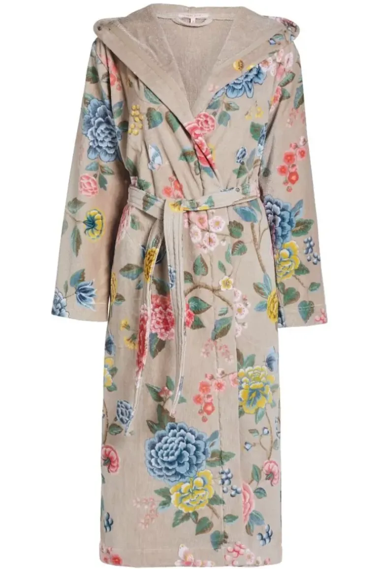 Deze Zachte Khaki Badjas Is Versierd Met Het Good Evening Dessin Vol Kleurrijke Bloemen. De Badjas Heeft Steekzakken En Een Capuchon. De Badjas Dient Voor Gebruik Gewassen Te Worden Volgens Het Care Label.