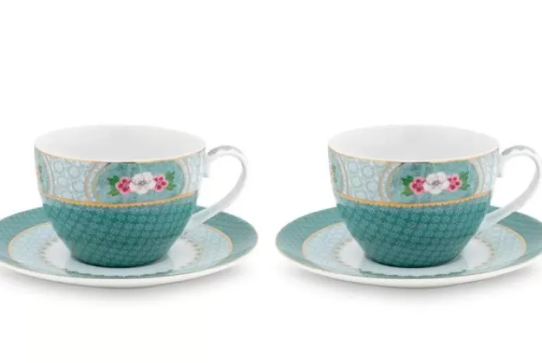 Deze Blauwe Cappuccino Kop En Schotel Zijn Versierd Met Een Blauw Dessin, Exotische Bloemen En Gouden Details. Vormt Een Mooie Combinatie Met De Rest Van Het Koffieservies Uit De Blushing Birds Collectie.