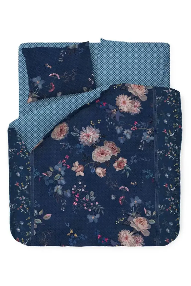 Dit Dekbedovertrek In Het Donkerblauw Is Geprint Met Het Tokyo Bouquet Dessin. Deze Print Is Opgebouwd Uit Elegante Takken En Zwierige Fantasie Bloemen. Het Dekbed Bevat Een Doorgestikte Rand, Striksluiting En Is Afgewerkt Met Een Gestreepte Bies. De Achterkant Is Donkergroen, Geprint Met Een Boogjes Dessin, Hierdoor Kan Het Kussen Dubbelzijdig Gebruikt Worden.