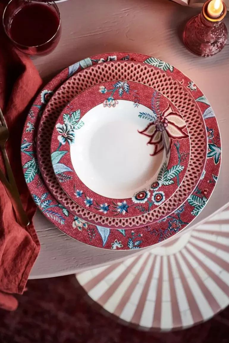 Fleur Je Tafel Op Met Dit Diepe Bord Uit De Flower Festival Collectie. Het Bord Heeft Een Bloemendessin Met Fantasierijke Rode En Roze Chintzbloemen Met Lichtblauwe En Groene Bladeren. Ideaal Om Te Gebruiken Als Soep- Of Pastabord.