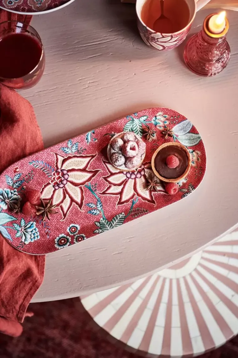 Serveer Je Lekkernijen Op Deze Taartplateau Uit De Flower Festival Collectie. De Plateau Heeft Een Bloemendessin Met Fantasierijke Rode En Roze Chintzbloemen Met Lichtblauwe En Groene Bladeren.