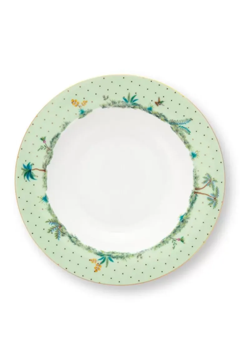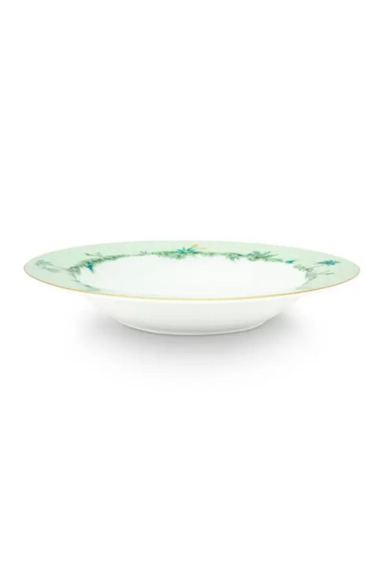 Dineren Met Het Gezin Of Met Vrienden? Dit Diepe Bord Is Perfect Te Gebruiken Voor Het Voorgerecht. Het Diepe Bord Heeft Een Groene Achtergrond Met Gouden Stippen En Is Rond Het Midden Versierd Met Exotische Planten. Perfect Te Combineren Met De Andere Borden Uit De Jolie-Collectie.