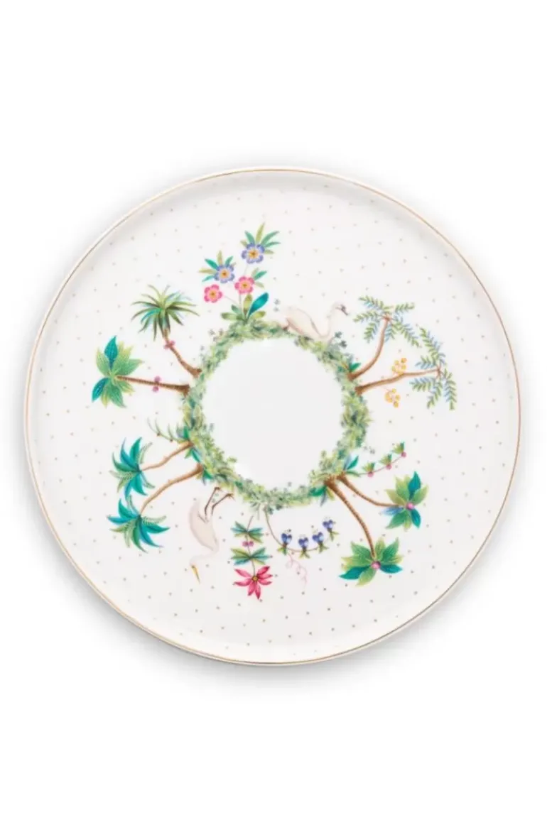 Gebruik Deze Taartplateau Bij Een High Tea Met Vrienden Om Een Heerlijke Taart Te Laten Zien. De Bodem Van Deze Taartplateau Is Blauw, Wat De Schaal Een Elegante Uitstraling Geeft. Het Bord Van Dit Dienblad Heeft Een Witte Achtergrond Met Gouden Stippen. Bovendien Geeft De Taartplateau Je Het Gevoel Van Een Tropisch Eiland Door Zijn Design. In Het Midden Vind Je Verschillende Planten, Bloemen En Prachtige Palmbomen.