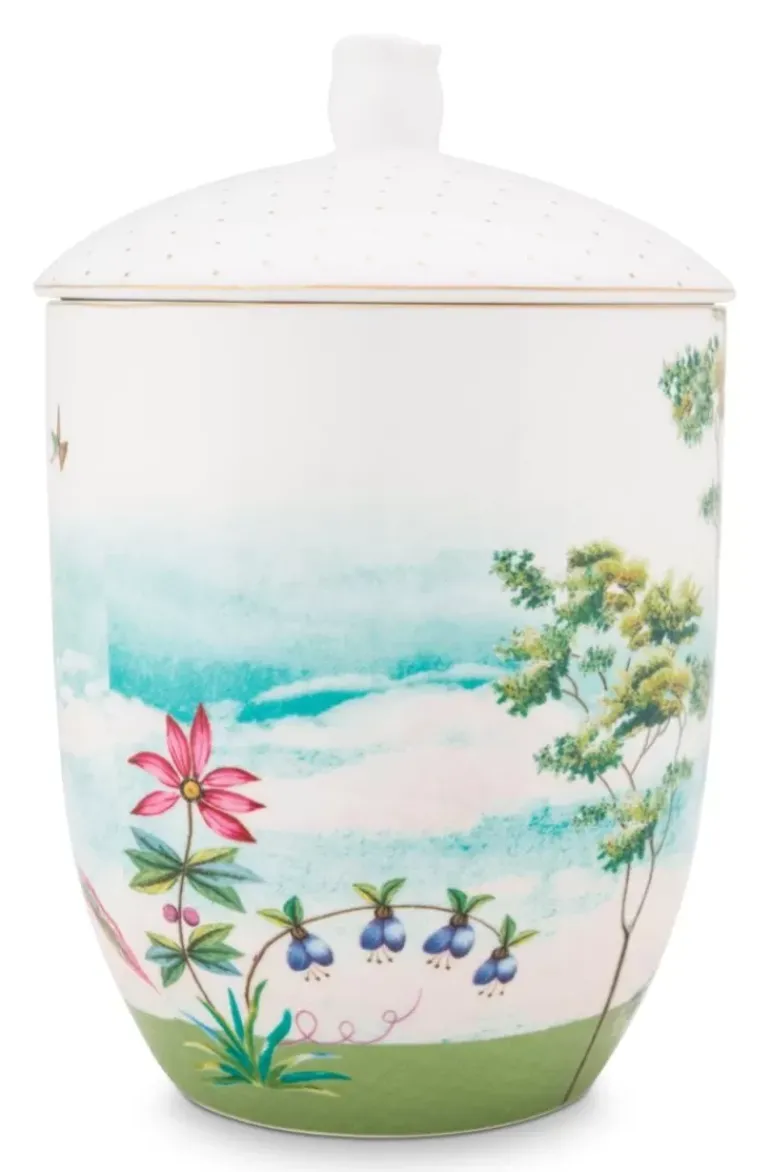Deze Prachtige Voorraadpot Geeft Je Een Complete Natuurlijke Feer. Met Een Achtergrond Van Wolken En De Tropische Planten Waan Je Je In Een Wereld Vol Natuur. Op De Voorkant Is Een Reiger Afgebeeld Onder Een Paraplu. Deze Tropische Vibe Wordt Gecombineerd Met Een Witte Deksel En Kleurrijke Bloemen. Combineer Deze Voorraadpot Met Andere Items Uit Onze Jolie-Collectie Voor Een Verbluffend Resultaat.