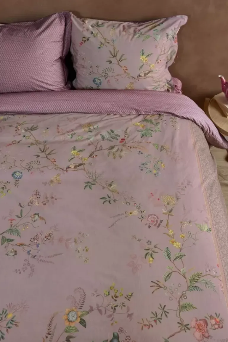 Het Autunno Kussensloop Heeft Een Dessin Van Elegante Bloemtakken Op Een Lila Ondergrond En Verticale Banden Met Aan Weerszijden Een Kleine Geometrische Print. Aan Elke Tak Groeien Verschillende Fantasiebloemen, Bessen En Bladeren En Hier En Daar Houdt Een Vogel Zich Schuil Tussen De Bladeren.