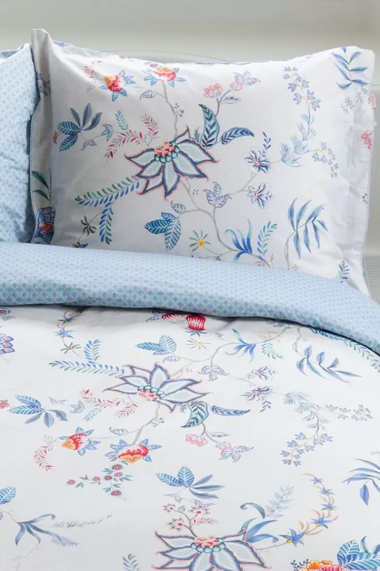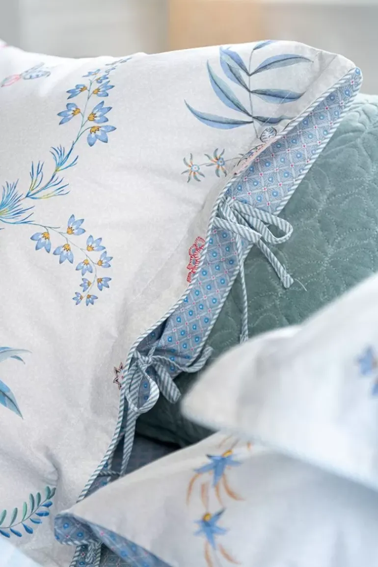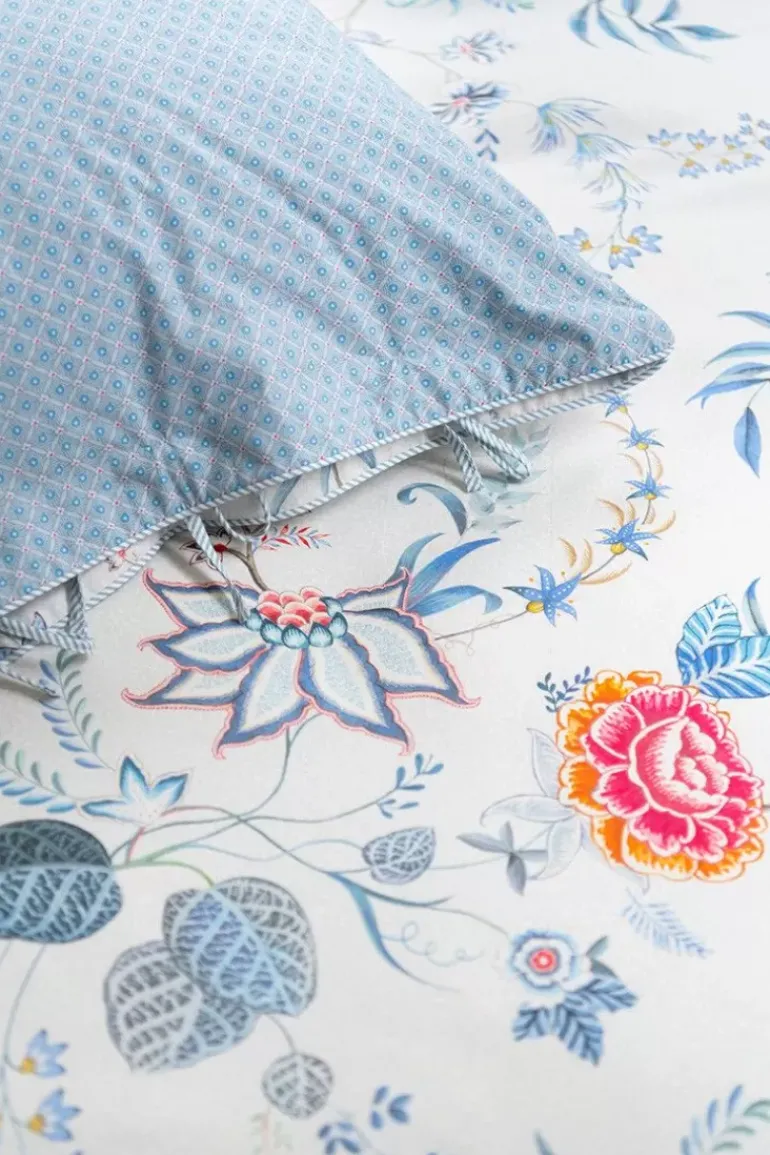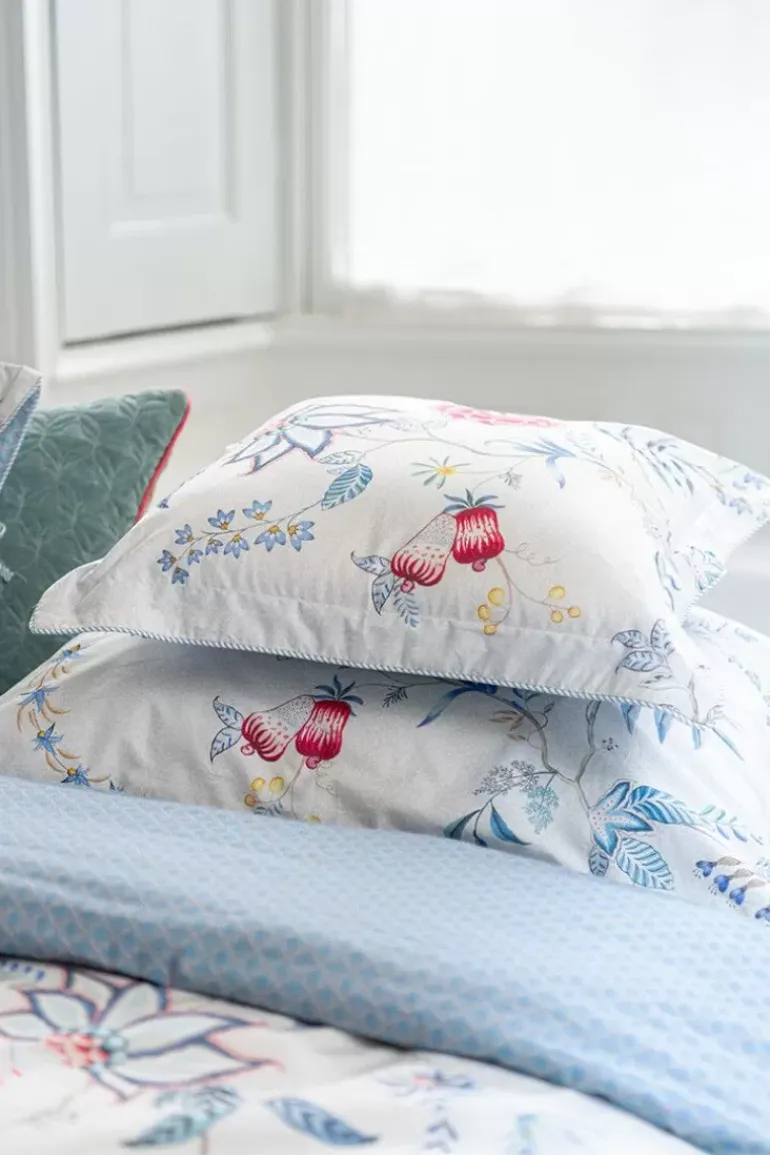 Het Witte Kussensloop Flower Festival Bestaat Uit Een Rijk Bloemendessin, Opgebouwd Uit Een Variatie Van Fantasierijke Rode En Roze Chintzbloemen Met Lichtblauwe En Groene Bladeren. De Speels Geplaatste Bloementakjes Met Grote Uitgewerkte Gedecoreerde Bloemen En Bladeren Geven Dit Verfijnde Dessin Een Extra Rijke Beleving.