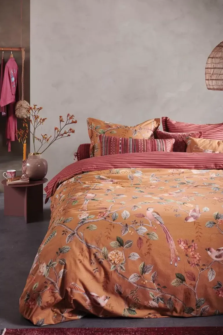 Dit Kussensloop In Geel Is Geprint Met Het Good Nightingale Dessin. Deze Print Is Opgebouwd Uit Bloemtakken En Verschillende Soorten Bloemen En Vogels. Het Kussen Bevat Een Doorgestikte Rand, Striksluiting En Is Afgewerkt Met Een Gekleurde Bies. De Achterkant Is Geprint Met Een Streepdessin, Hierdoor Kan Het Kussen Dubbelzijdig Gebruikt Worden.