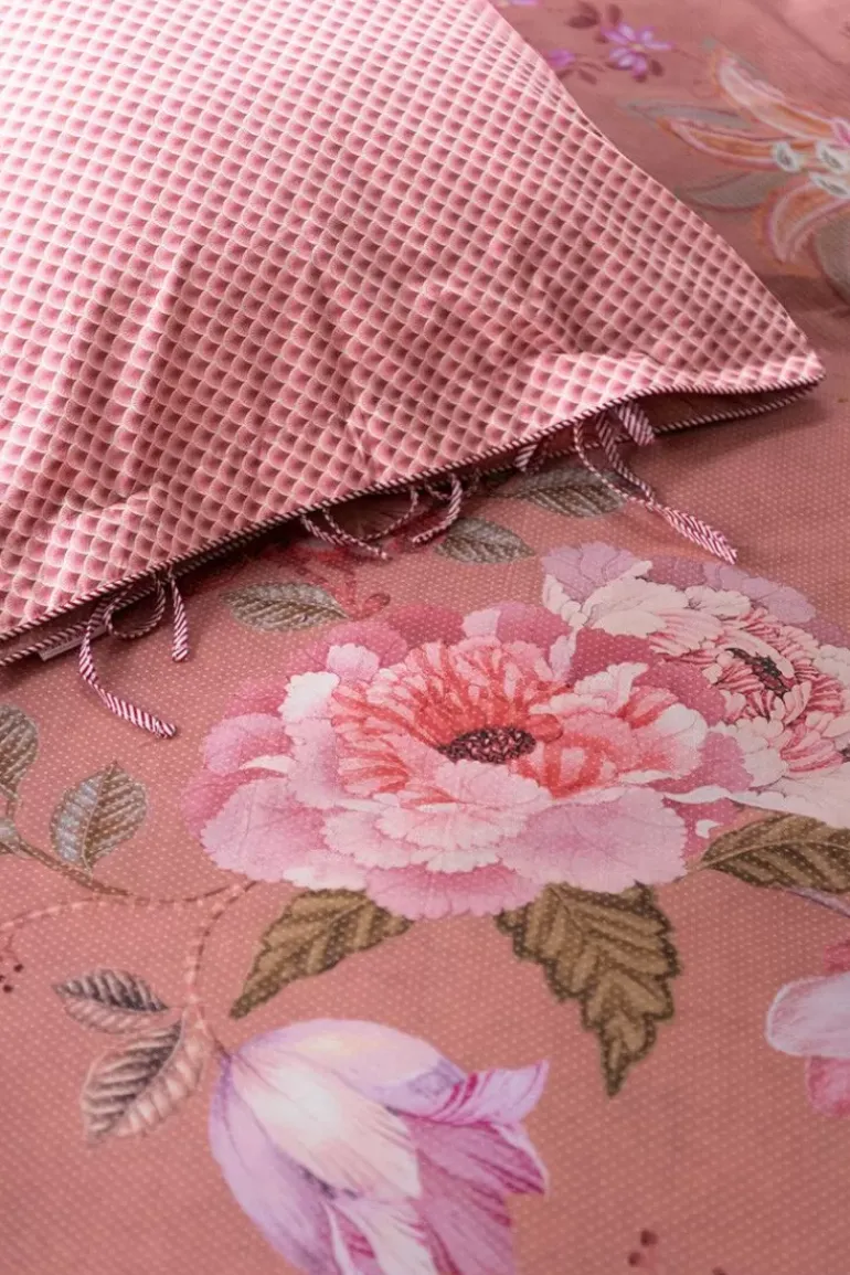 Het Roze/Terra Bloemendessin Van Het Kussensloop Tokyo Bouquet Is Een Geplaatste Print Met Grote Elegante Fantasiebloemen En Kleine Bloementakken. Over Het Kussensloop Zit Een Subtiel Patroon, Die De Print Nog Meer Diepte Geeft. Een Prachtige Blikvanger Voor Je Slaapkamer.