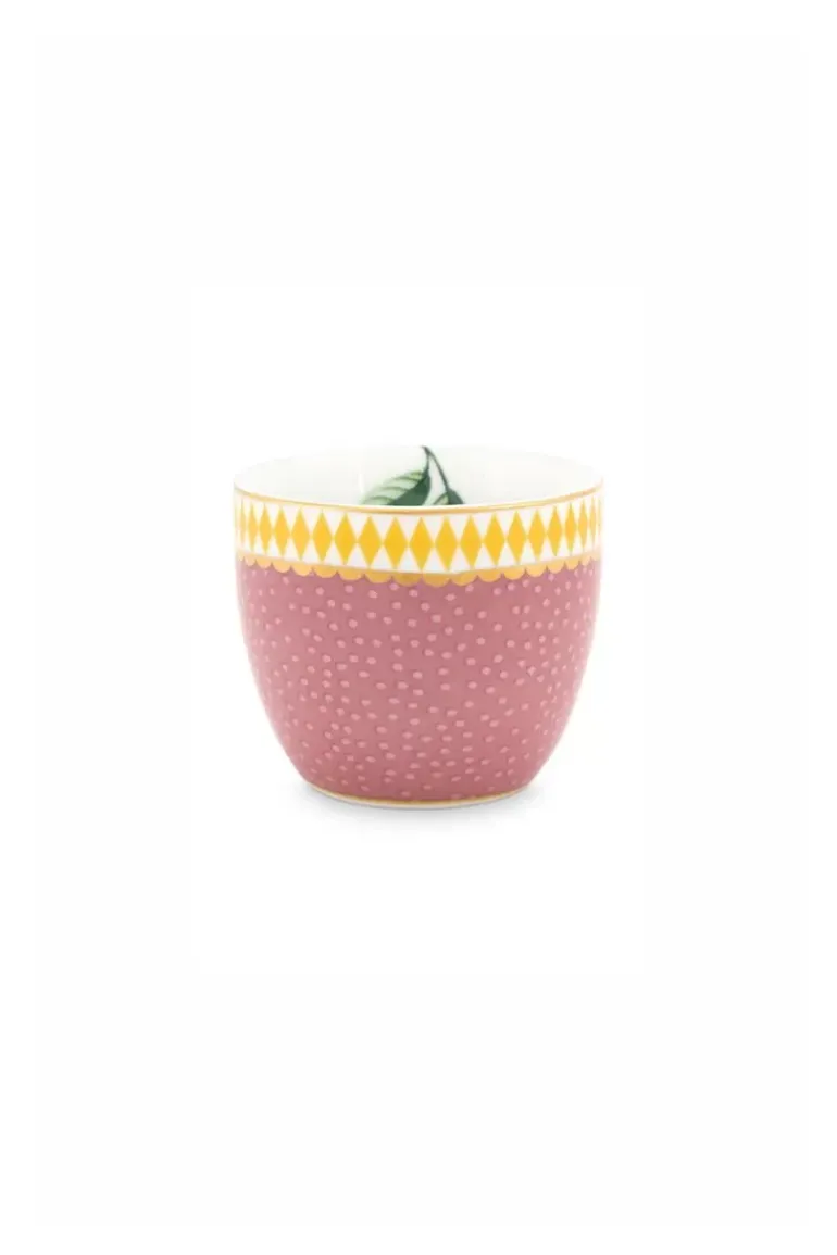 Dit Roze Eierdopje Is Versierd Met Een Verfijnde Roze Print. De Rand Heeft Een Geel-Wit Dessin.