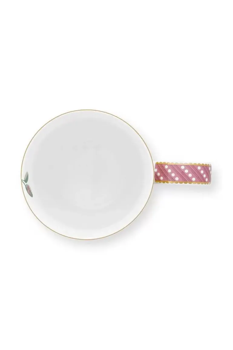 Geniet Van Een Warme Kop Thee Of Koffie Uit Deze Extra Grote, Roze La Majorelle Mok. De Mok Is Versierd Met Een Exotische Palmboom, Waar Een Witte Reiger Naast Staat Te Pronken Op Een Wit/Gele Gestreepte Achtergrond. De Hendel Van De Mok Is Versierd Met Een Witte Rand Die Is Gedecoreerd Met Roze Details Die De Mok Een Rijke Uitstraling Geven. Met Ons La Majorelle Porselein Zul Je Jouw Servieskast En Tafel Laten Stralen!