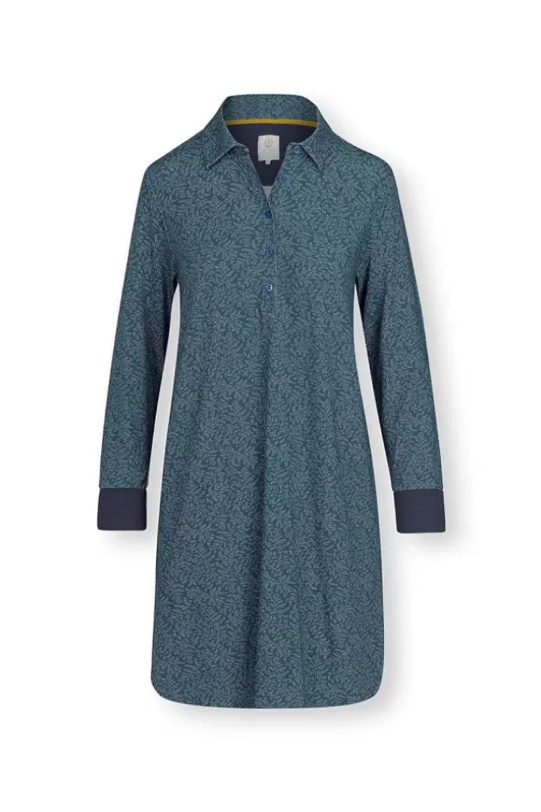 Dit Nachthemd In Het Blauw Is Uitgevoerd Met Het Elegante Leafy Dots Dessin. Het Herhaalde Dessin Is Opgebouwd Uit Een Variatie Van Bladeren. Het Nachthemd Bevat Een Kraag Hals Met Bijpassende Knopen.