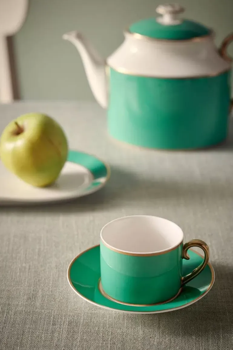 Deze Groene Cappuccino Kop & Schotelheeft Een Groen Dessin Met Een Goud Handvat. Het Porselein Is Gemaakt Van Bone China, Een Hoogwaardig Dun Porselein Met Een Verfijnd Design. Ook Verkrijgbaar In 120 Ml. Perfect Te Combineren Met De Andere Items Van Pip Chique.