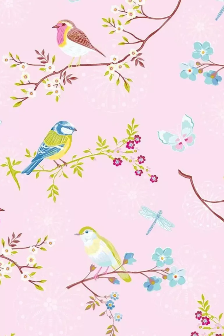 Geef Je Interieur Een Speelse Twist Met Dit Lichtroze Early Bird Behang. Het Patroon Van Kleurrijke Vogels, Bloementakken En Vlinders Transformeert Elke Kamer Tot Een Elegante Ruimte.