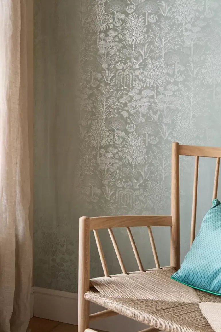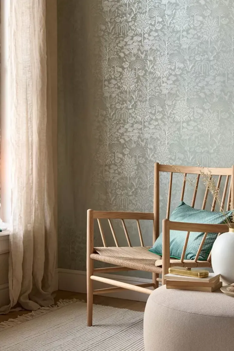Geef Je Huis Een Betoverende Make-Over Met Het Prachtige Origami Behang In De Kleur Licht Groen/Zilver. Het Design Heeft Een Herhaald Patroon Van Uitgewerkte Gestileerde Bomen En Vogels. De Matte Ondergrond Met Metallic Print Geeft Het Behang Een Speciale En Verfijnde Uitstraling. Het Origami Behang Is Verkrijgbaar In Meerdere Kleuren: Gebroken Wit/Zilver, Oker/Goud, Terra/Rose Goud En Donkerblauw/Rose Goud.