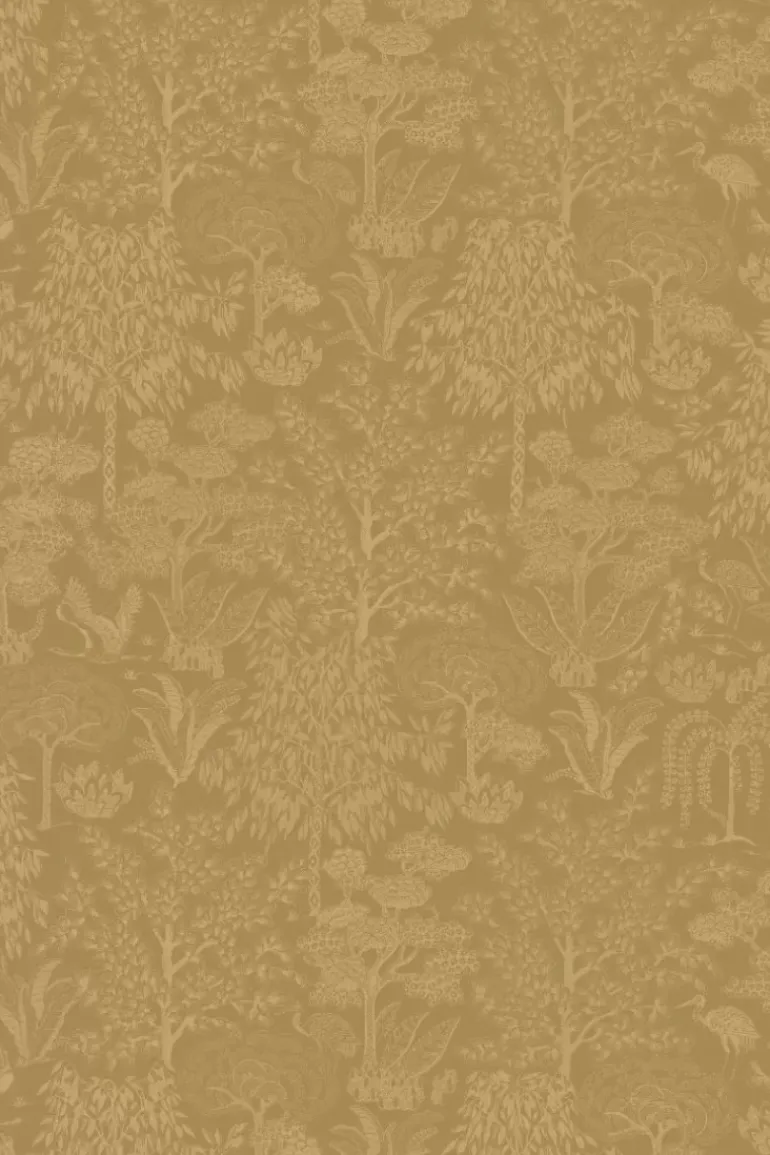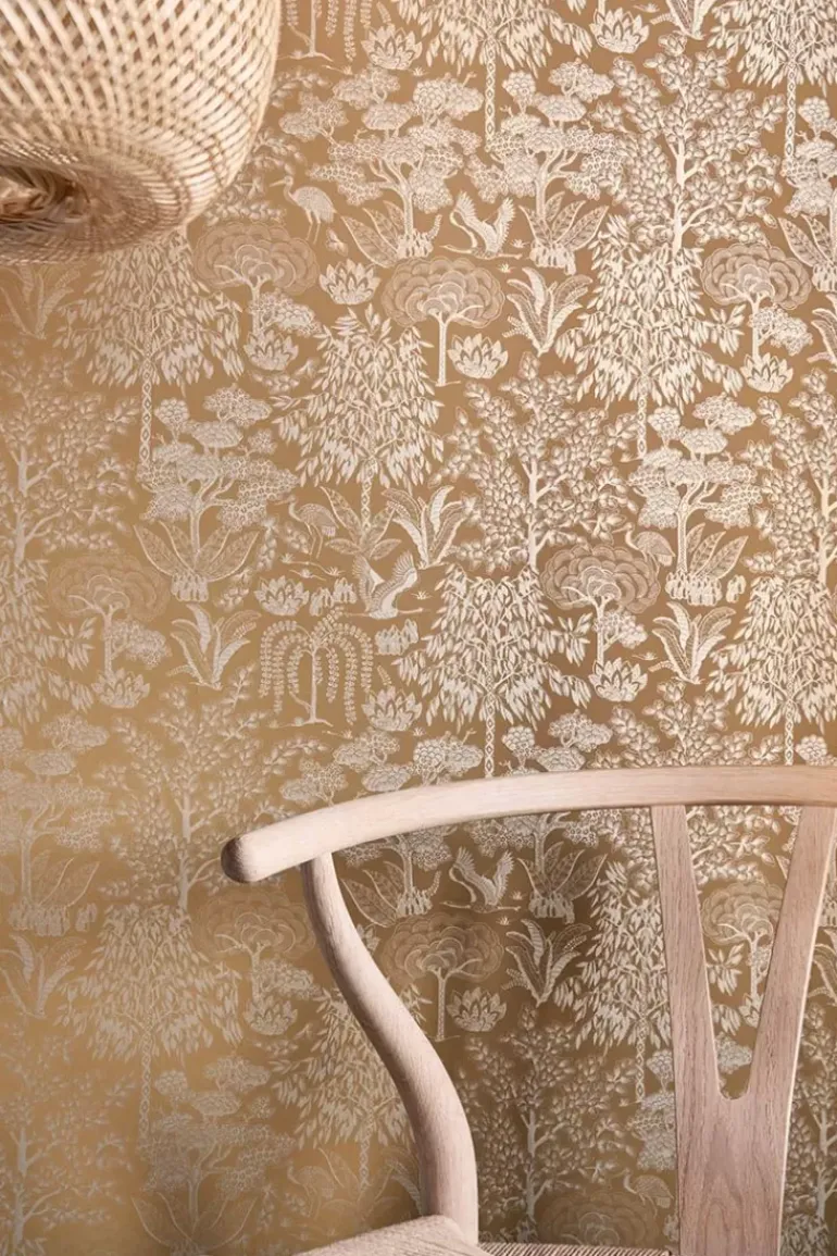 Geef Je Huis Een Betoverende Make-Over Met Het Prachtige Origami Behang In De Kleur Oker/Goud. Het Design Heeft Een Herhaald Patroon Van Uitgewerkte Gestileerde Bomen En Vogels. De Matte Ondergrond Met Metallic Print Geeft Het Behang Een Speciale En Verfijnde Uitstraling. Het Origami Behang Is Verkrijgbaar In Meerdere Kleuren: Licht Groen/Zilver, Gebroken Wit/Zilver,, Terra/Rose Goud En Donkerblauw/Rose Goud.