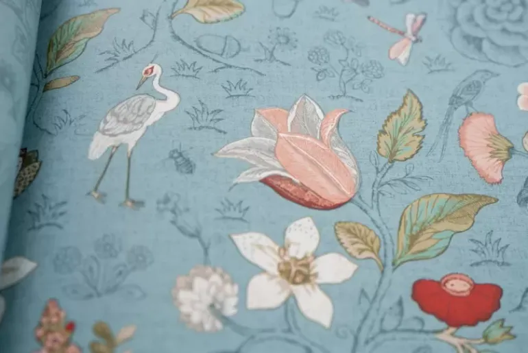 Dit Zeeblauwe Behang Met Levendig Spring To Life Patroon Transformeert Elke Kamer In Het Huis Tot Een Stijlvolle Ruimte. De Combinatie Van Bloemen, Planten En Vogels Creeert Een Verhalend Karakter En Een Unieke Sfeer.